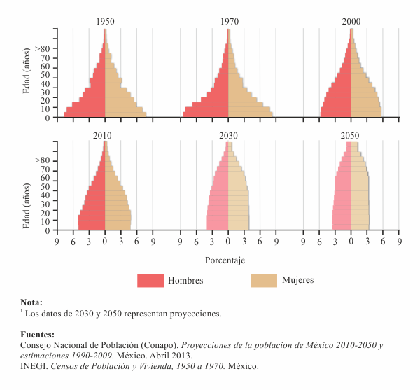 | Figura 1.1.3 Pirámides de edad en México, 1950-20501 |
