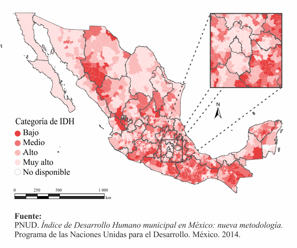 En 2010, México obtuvo un valor de IDH de 0.739, lo que a nivel internacional lo ubicó en el segundo cuartil correspondiente a un IDH clasificado como alto (PNUD, 2013). No obstante, al interior del país las diferencias son importantes. En ese año, el 70.4% de su población habitaba en municipios con índice de desarrollo humano muy alto, 14.6% en municipios con desarrollo alto, 9% en municipios con desarrollo medio y 6% en municipios donde el desarrollo humano se clasificaba como bajo (PNUD, 2014).