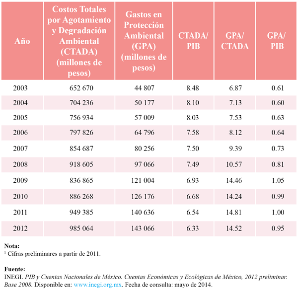 Tabla 1.7.2 Costos Totales por Agotamiento y Degradación Ambiental y Gastos en Protección Ambiental con respecto al Producto Interno Bruto, 2003-2012