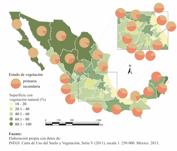 En 2011, la vegetación natural cubría 71.3% del territorio (alrededor de 139.1 millones de hectáreas). Por su extensión predominaban los matorrales xerófilos (25.8% del país), los bosques templados (16.6%) y las selvas (16.3%; Mapa 2.1.1 y Figura 2.1.1). Usos del suelo antrópicos, como la agricultura y los pastizales inducidos y cultivados (estos últimos empleados principalmente por las actividades pecuarias) cubrían 26.6% del país (16.8 y 9.8%, respectivamente) y en poco menos del uno por ciento de la superficie nacional se asentaban las zonas urbanas y otros asentamientos humanos.