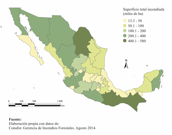 Mapa 2.3.1 Superficie incendiada por entidad federativa, 1998-2013 |