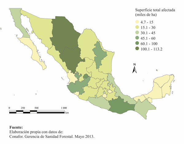 Mapa 2.3.2 Superficie afectada por plagas y enfermedades forestales por entidad federativa, 1990-2012 |