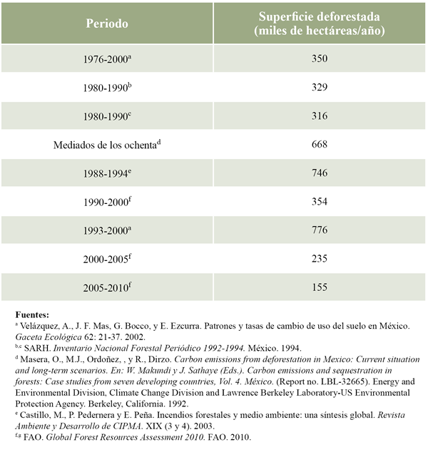 Tabla 2.3.1. Estimaciones de la deforestación anual en México para distintos periodos. |