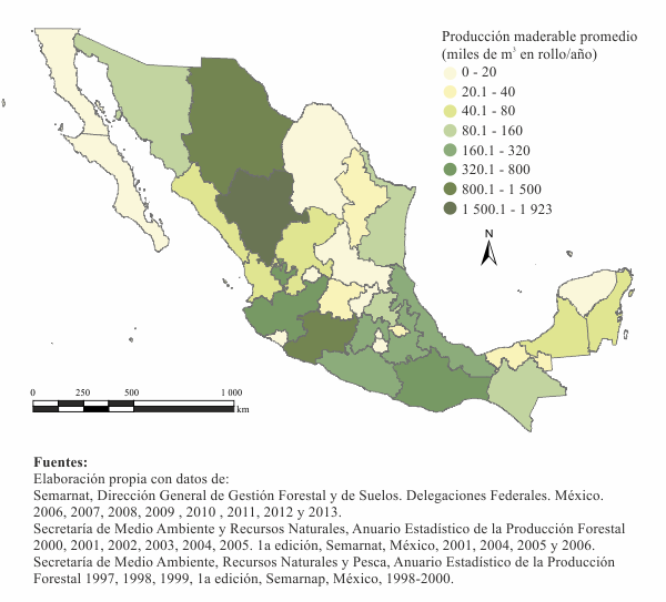Los estados que más contribuyeron a la producción forestal maderable en el periodo 1990-2012 fueron Durango (1.92 millones de m3 anuales en promedio, 27.4% de la producción total del periodo), Chihuahua (1.4 millones, 20%) y Michoacán (956 mil, 13.6%; Mapa 2.15). En contraste, Baja California, Morelos y Colima fueron los que contribuyeron en menor proporción al volumen total nacional (0.03, 0.04 y 0.06%, respectivamente).