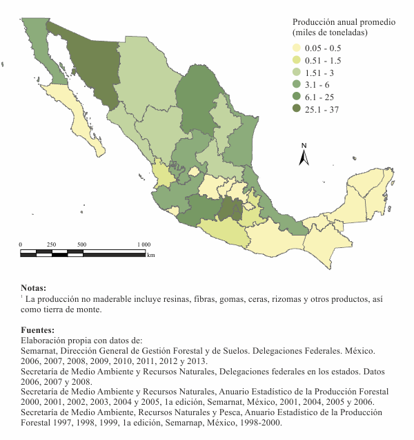 Las entidades federativas que registraron la mayor producción no maderable anual promedio entre 1997 y 2012 fueron el estado de México (poco menos de 47 mil toneladas), Sonora (46.8 miles), Distrito Federal (34.5 miles) y Morelos (26.6 miles); las que registraron menores volúmenes de producción fueron Aguascalientes (46 toneladas anuales en promedio), Quintana Roo (47), Baja California Sur (51), Yucatán (134; Mapa 2.4.3).