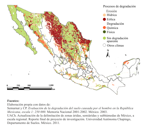 Mapa 3.3.2 Procesos de degradación del suelo en las tierras secas de México |