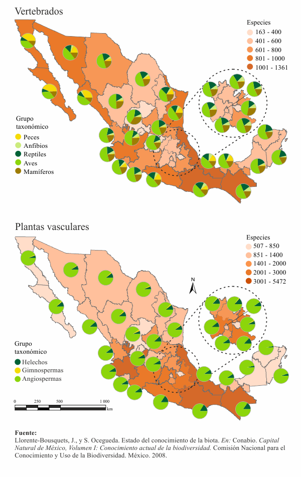 En nuestro país la biodiversidad no se distribuye de manera homogénea; existen regiones particularmente ricas en especies, como el Eje Neovolcánico Transversal, las Sierras Madre Oriental y Occidental y las zonas donde confluyen las regiones Néartica y Neotropical (Koleff et al., 2008). Los estados de Oaxaca, Veracruz y Chiapas encabezan la lista de las entidades con más especies de vertebrados, plantas vasculares y artrópodos, sin embargo, debe destacarse la riqueza en especies de vertebrados de zonas áridas que tienen los estados del norte de la República (Mapa 4.1.1).