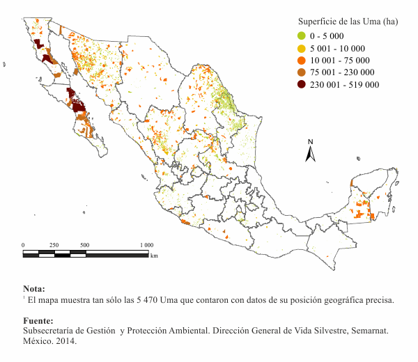 1 Si se considera el número histórico de Umas registradas ante la Dirección General de Vida Silvestre (DGVS) de la Semarnat, el total de unidades en 2012 fue de 11 655 y la superficie acumulada de 37.63 millones de hectáreas.