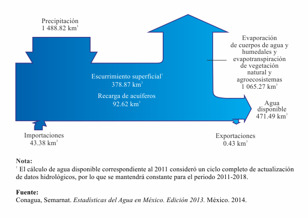 El volumen promedio de agua que ingresa al país vía la precipitación es de 1 488.8 km3 anuales, del cual 71.5% regresa a la atmósfera por evapotranspiración (Figura 6.1.1.1). Para tener el balance completo es necesario agregar alrededor de 48.4 km3 anuales que ingresan por importaciones de los ríos de las fronteras norte y sur y restar las exportaciones a los Estados Unidos que contabilizan 0.432 km3 anuales. Así, en el balance general la disponibilidad natural media en México es de 471.5 km3 anuales de agua en promedio al año.