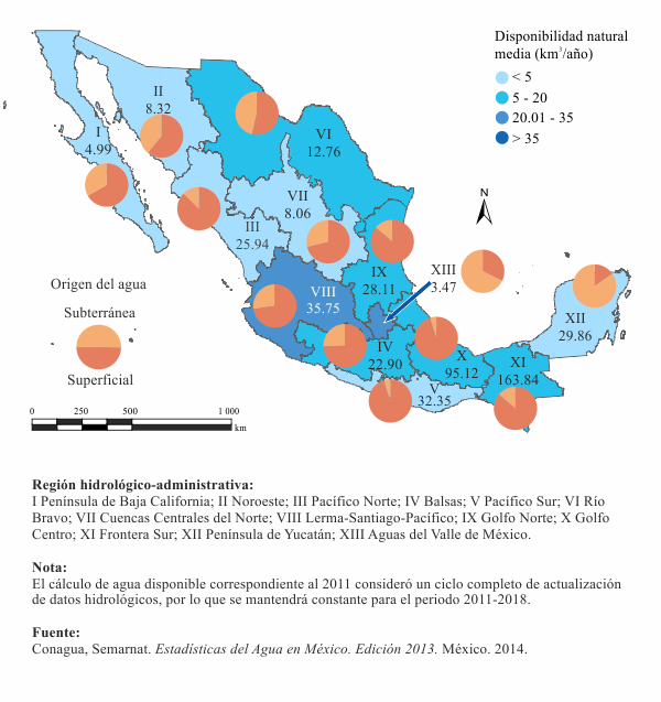 | Mapa 6.1.1.1 Disponibilidad natural media total por región hidrológico-administrativa, 2012 |