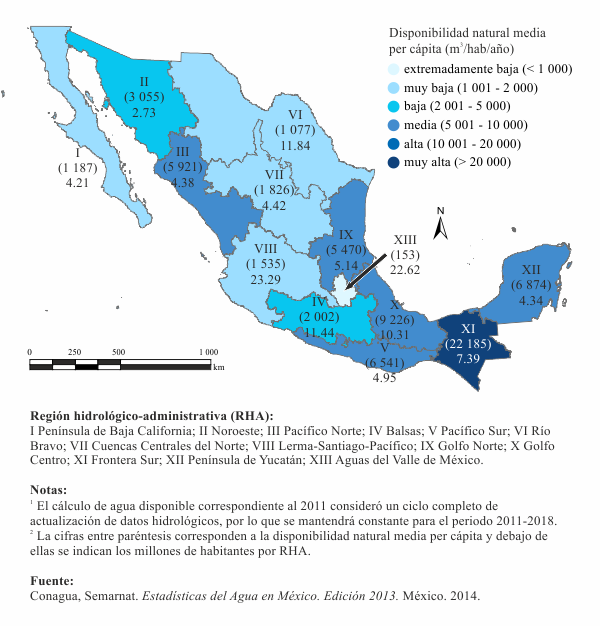 Los valores nacionales per cápita pueden enmascarar situaciones de estrés hídrico a nivel regional. Mientras que la región Aguas del Valle de México tenía en 2012 una disponibilidad de apenas 153 m3 por habitante por año, la región Frontera Sur registraba 22 185 m3, es decir, una disponibilidad 145 veces mayor (Mapa 6.1.1.2). Considerando a las regiones hidrológico-administrativas con disponibilidades clasificadas como muy bajas, resulta que más de 66.39 millones de habitantes (cerca del 56.71% de la población nacional) se encontraban en 2012 en situación de estrés hídrico.