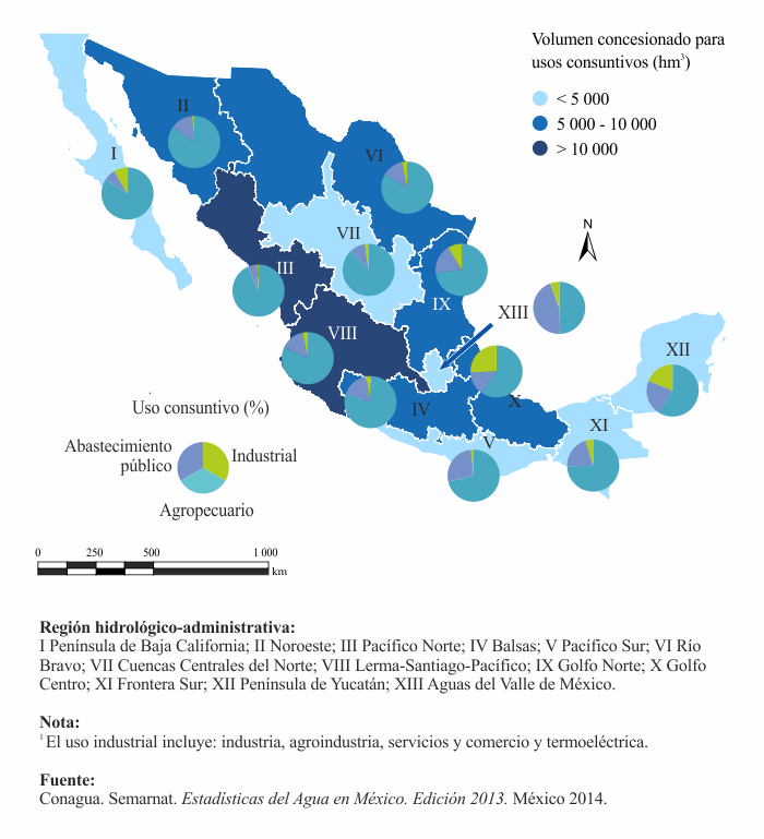Dentro del país también existe un uso diferenciado del agua. En 2012, en la región Pacífico Norte el 93.3% del agua se destinaba a actividades agropecuarias, mientras que en la región del Valle de México este uso sólo alcanzó el 49.5% (Mapa 6.1.3.1). Las regiones que en términos relativos asignaron más agua para el abasto público fueron la de Aguas del Valle de México (45%), Pacífico Sur (26.8%), Frontera Sur (20.4%) y Península de Yucatán (17.9%). Aunque el volumen de agua destinado para el uso industrial es en general inferior al del abastecimiento público, en las regiones Pacífico Sur, Golfo Centro y Península de Yucatán el comportamiento es opuesto (con 29.2, 25.6 y 19.7 %, respectivamente).