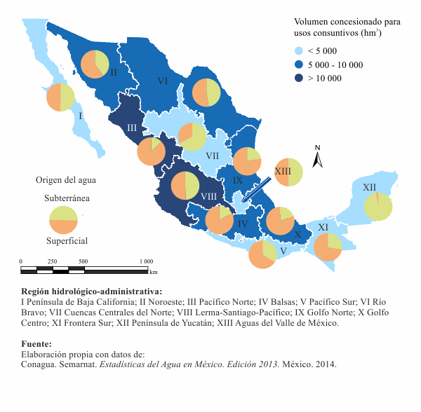Si se analiza el origen del agua concesionada en México, en 2012 el 61.6% provino de fuentes superficiales, mientras que 38.4% lo hizo de las subterráneas. Sin embargo, también existen marcadas diferencias al interior del país con respecto al uso de estas fuentes: en 2012 las regiones que usaron intensivamente las fuentes superficiales fueron Pacífico Norte (87.1% del total concesionado), Balsas (83%), Golfo Norte (80.9%) y Golfo Centro (76.1%), mientras que en las regiones Cuencas Centrales del Norte y Península de Yucatán se utilizó principalmente el agua subterránea (65.7 y 96.6%, respectivamente; Mapa 6.1.3.2).